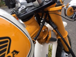 今回はモンキーのハンドルロックについて解説をします。モンキーのハンドルロックはヘッドライトの後ろ、フロントフォーク右側の真ん中辺りに付いてます。