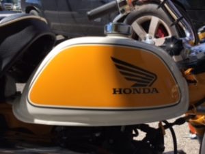 モンキーのタンクはキャブ車とFIで形状が違いいます。個人的にはこちらの方が好みでして、キャブ車の方は写真がないのですがピーナツタンクっぽい形状です。横から見ると三角形に近い形状ですね。このタンクには4.3Lほどガソリンが入るそうです。燃費がだいたいですがリッター60kmとすると満タンで約250km走る事が出来ます。250kmって東京から浜松辺りまでになりますね。これはすごい。