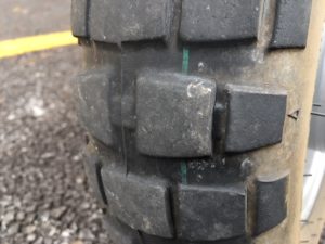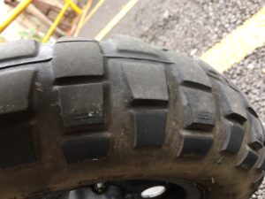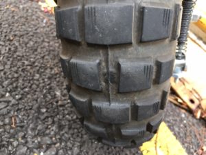 下の写真を見ると、センターのスリップサインと揃いそうです。もう、交換してもいい頃合いですね。横の溝はしっかり残ってます。攻めが足りないかな?w
