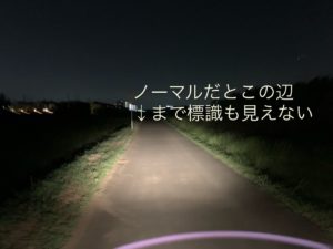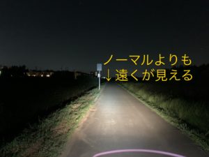 おー!ノーマルよりも10〜20m先くらい迄見えるじゃないですか!向きもちょうど良い感じです。取り付けたビスの向きが少し内側に向いていたので狙い通りセンターと少し左側を照らしてます。