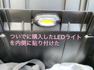 余談ですが、今回購入した両面テープを使って、ついでにボックス内にLEDライトを貼り付けました。