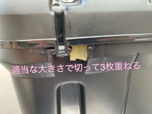 適当なサイズにカットします。それを隙間に貼っていくのです。ここで気が付きました。両面テープは要らなそうです。何故なら、この樹脂パッド結構な粘着力を持っています。